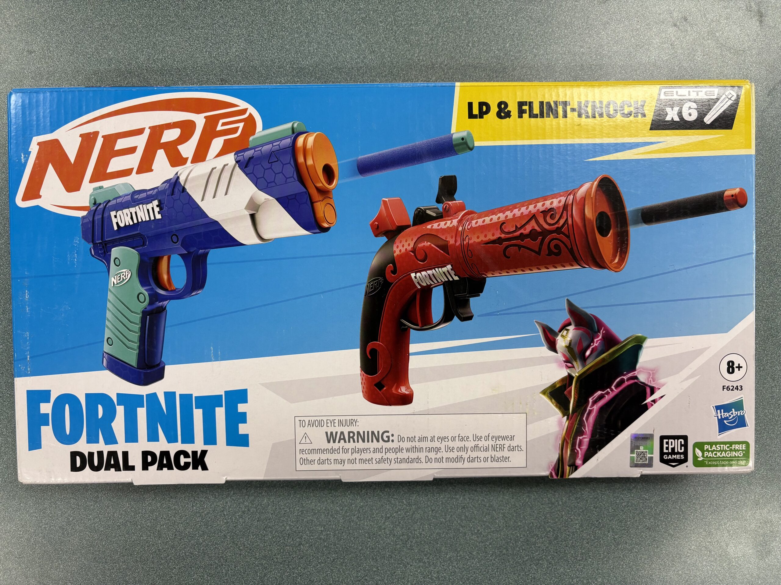 Fortnite Dual Pack toy guns. LP and Flint-Knock pistols from the video game. Comes with 6 Nerf darts. Ages 8+. See photos for how item will look when purchased, thanks!