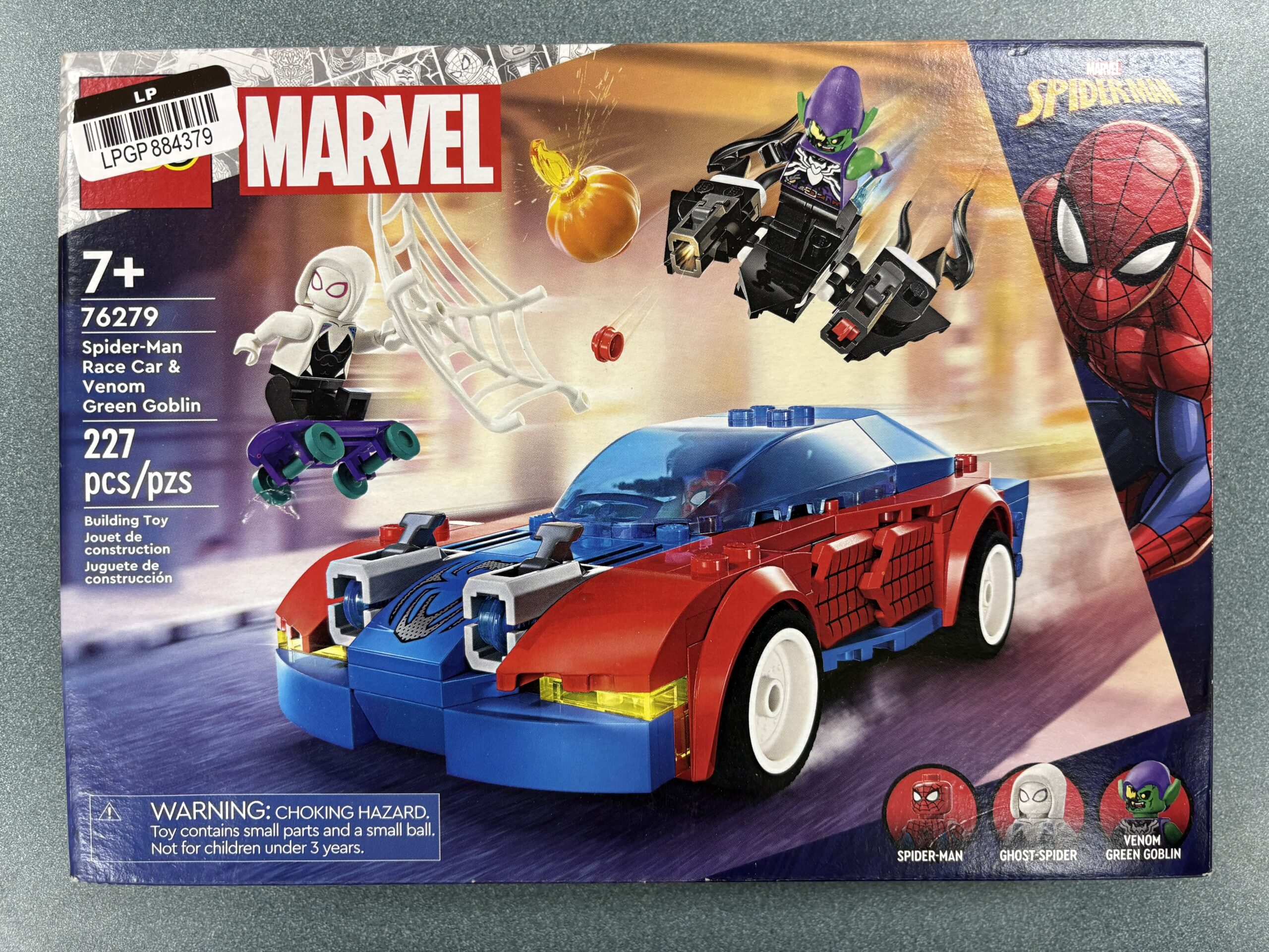 Lego Marvel’s Spider-Man Race Car set for ages 7+ with 227 pieces. Set number 76279. Please see the photos for how item looks when purchased, thanks!