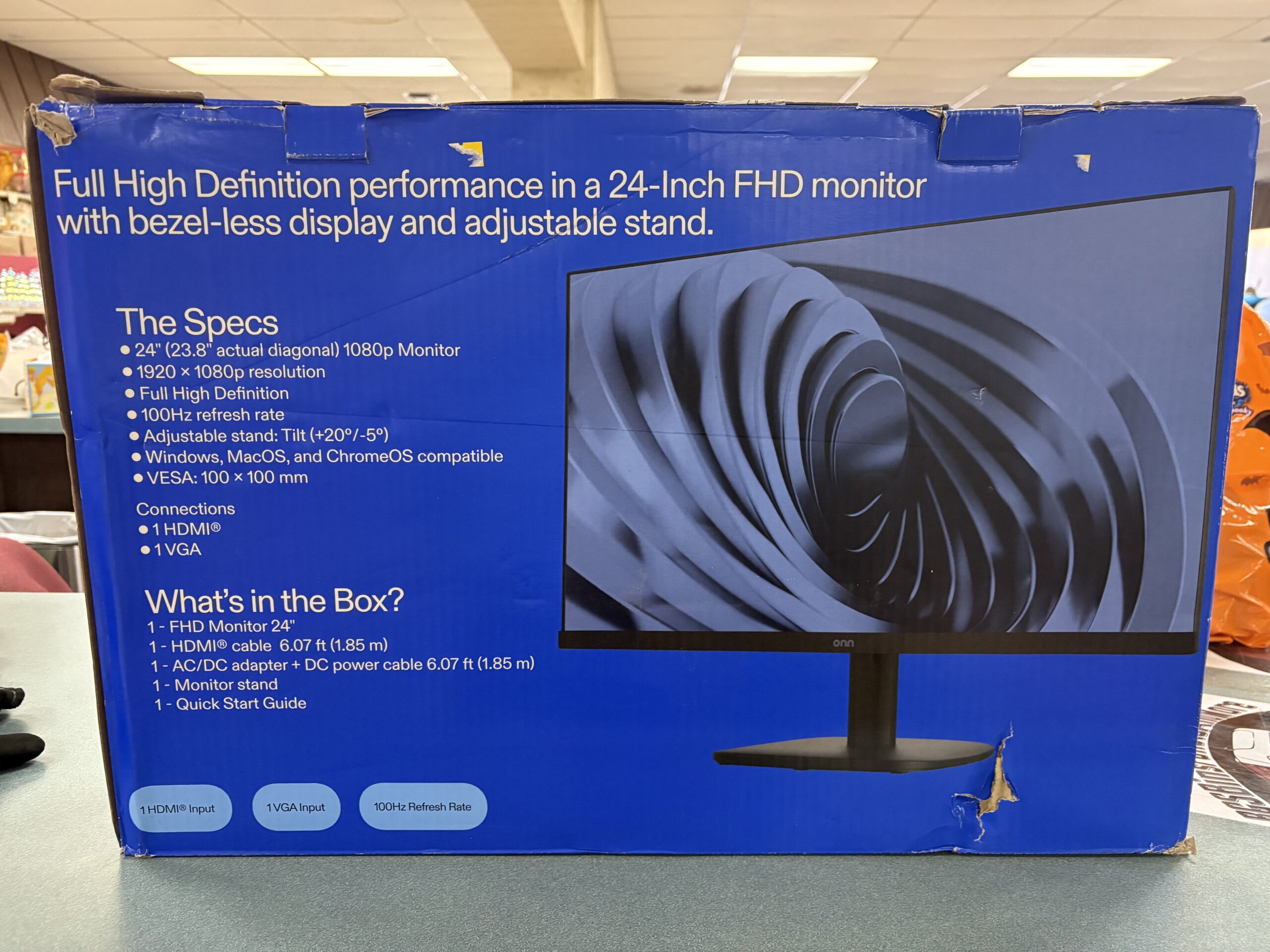 Onn 100 Hz Computer Monitor. Retail stores sell for 60, place a bid for a chance at it! Item was tested by us. Please see photos for how your item will look when picked up.